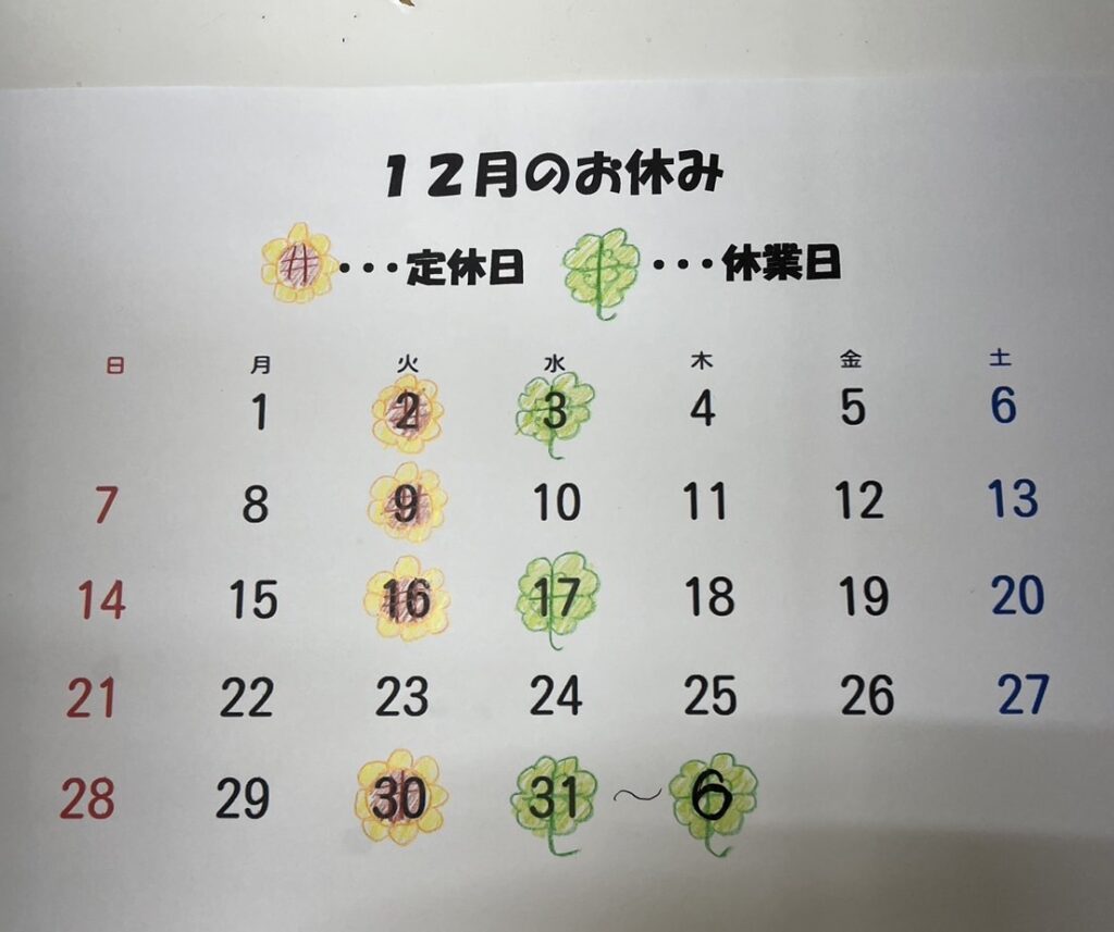 6日を除く、毎週火曜日と7日(水)・8日(木)・21日(水)はお休みします。