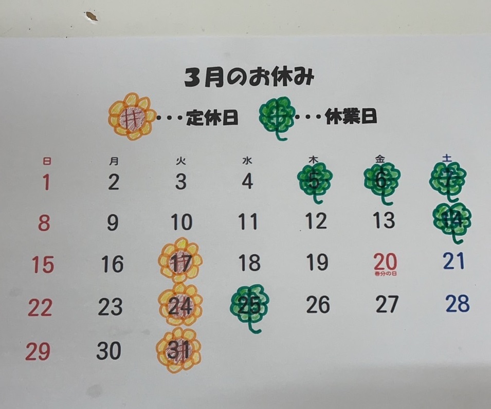 2026年 3月のお休みカレンダーです。17日・24日・31日の火曜日と5日(木)~7日(土)・14日(土)・25日(水)はお休みします。